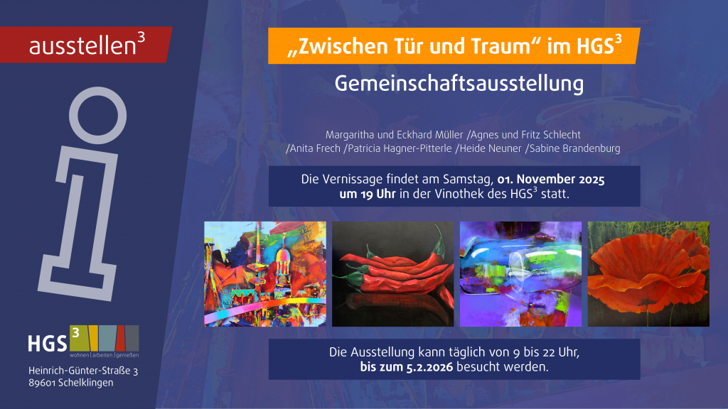 Die Vernissage zur Ausstellung findet am Freitag, 1. November 2025 um 19 Uhr in der Vinothek des HGS³ statt. Hierzu sind alle Interessierten ganz herzlich eingeladen.